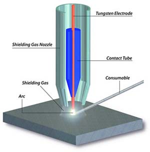 Gas tungsten arc welding (GTAW), also known as tungsten inert gas (TIG) welding, is an arc welding process that uses a no consumable tungsten electrode to produce the weld. The weld area is protected from atmospheric contamination by a shielding gas (usually an inert gas such as argon), and a filler metal is normally used, though some welds, known as autogenously welds, do not require it. A constant-current welding power supply produces energy which is conducted across the arc through a column of highly ionized gas and metal vapors known as plasma.